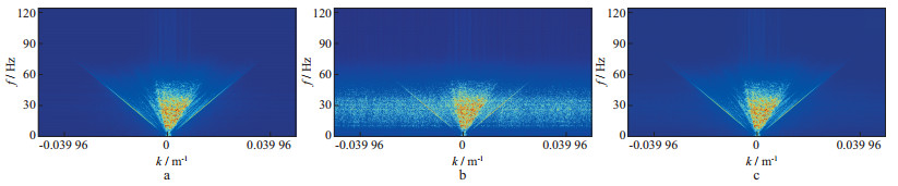 图 11 不同采样间隔下的F-K谱 a 均匀采样10 m间隔; b 压缩感知采样, 10 m规则网格抽稀到12.5%; c 压缩感知恢复至10 m规则采样结果 |
