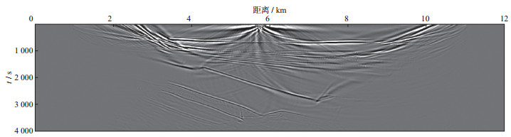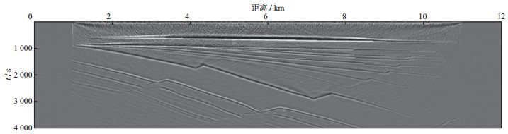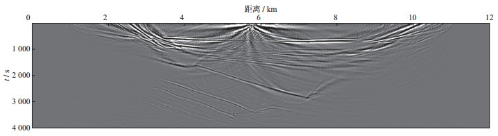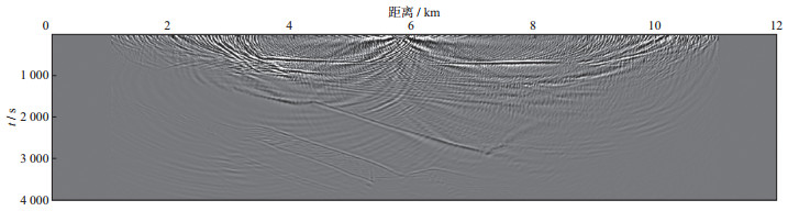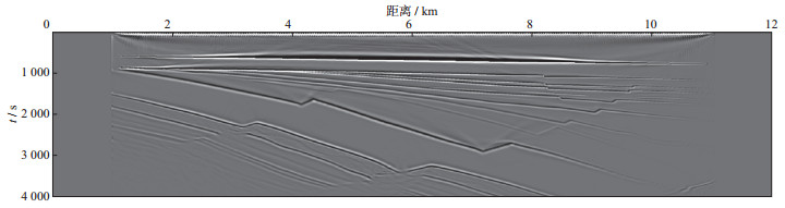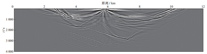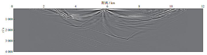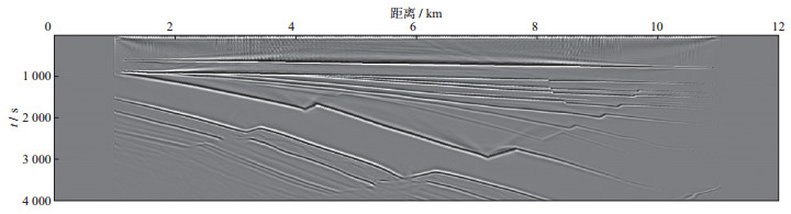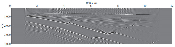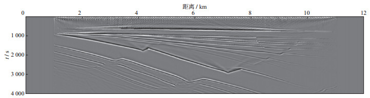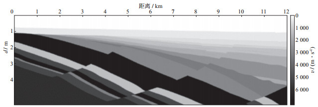 3 空间随机采样数据的规则无假频恢复测试为了验证本文提出的随机观测系统设计思想与方法的有效性, 利用胜利油田某工区典型的二维速度模型数据进行测试, 该模型深度为4 km, 横向距离为12 km(图 8)。采用有限差分正演模拟方法, 震源采用30 Hz雷克子波, 采样间隔为0.25 ms, 采样长度为4 s。震源范围为1~11 km, 震源间隔为40 m。检波点的覆盖范围为1~11 km, 检波点间隔为10 m。