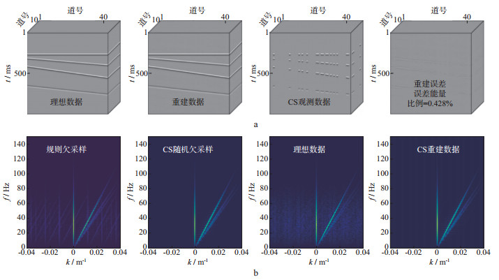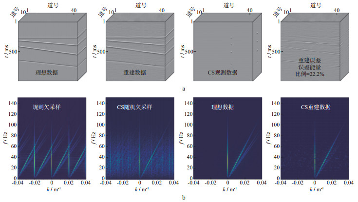 从数据采样理论看, Shannon采样定理解释了如何进行规则离散采样才能完整地恢复成连续数据, 而压缩感知采样建立了一套由随机离散采样数据恢复成连续数据的理论, 它要求数据在某种变换域表现为稀疏特征。对于地震数据, 多次覆盖的观测系统使得地震信号表现出高维空间特征。不同于仅关注一维信号特征的Shannon采样定理, 高维地震信号的空间结构取决于地下地质结构的复杂程度, 如平缓层状地层中的地震波场相比复杂断块区的地震波场更加简单, 稀疏特征更明显。