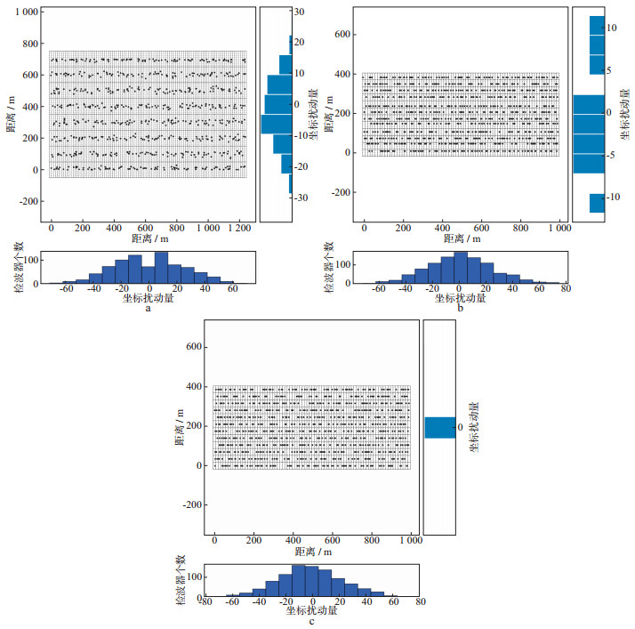 图 6 以常规单炮检波点排列方式为基础网格生成的随机观测系统 a Inline/Crossline方向检波点位置完全高斯随机扰动; b Inline方向检波点位置高斯随机扰动, Crossline线间距高斯随机扰动; c Inline方向检波点位置高斯随机扰动, Crossline方向等线间距 |