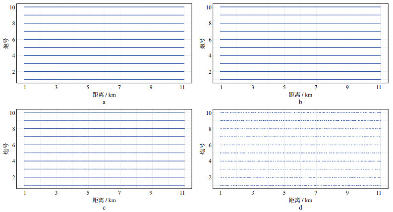 图 9 第1炮至第10炮检波点覆盖位置 a 均匀采样10 m间隔; b 均匀采样20 m间隔; c 均匀采样40 m间隔; d 压缩感知采样, 10 m规则网格抽稀12.5%结果 |