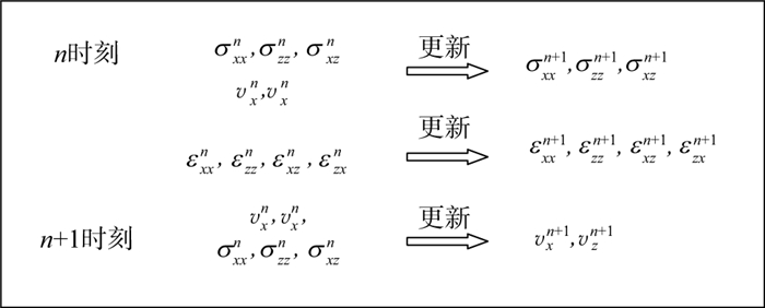| $ \left\{ \begin{array}{l} \frac{{\partial {\sigma _{xx}}}}{{\partial t}} = \rho v_{\rm{P}}^2\left( {\frac{{\partial {v_x}}}{{\partial x}} + \frac{{\partial {v_z}}}{{\partial z}}} \right) - 2\rho v_{\rm{S}}^2\frac{{\partial {v_z}}}{{\partial z}}\\ \frac{{\partial {\sigma _{zz}}}}{{\partial t}} = \rho v_{\rm{P}}^2\left( {\frac{{\partial {v_x}}}{{\partial x}} + \frac{{\partial {v_z}}}{{\partial z}}} \right) - 2\rho v_{\rm{S}}^2\frac{{\partial {v_x}}}{{\partial x}}\\ \frac{{\partial {\sigma _{xz}}}}{{\partial t}} = 2\rho v_{\rm{S}}^2\frac{1}{2}\left( {\frac{{\partial {v_z}}}{{\partial x}} + \frac{{\partial {v_x}}}{{\partial z}}} \right)\\ \frac{{\partial {v_x}}}{{\partial t}} = \frac{1}{\rho }\left( {\frac{{\partial {\sigma _{xx}}}}{{\partial x}} + \frac{{\partial {\sigma _{xz}}}}{{\partial z}}} \right)\\ \frac{{\partial {v_z}}}{{\partial t}} = \frac{1}{\rho }\left( {\frac{{\partial {\sigma _{xz}}}}{{\partial x}} + \frac{{\partial {\sigma _{zz}}}}{{\partial z}}} \right) \end{array} \right. $ | (3) |