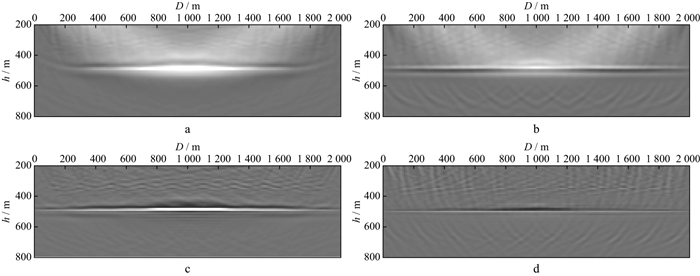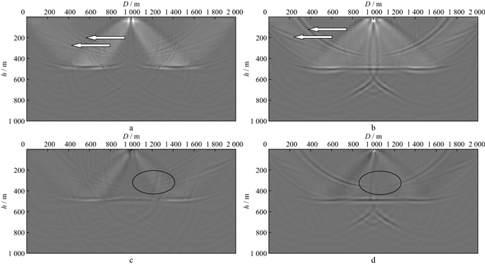 图 3为利用伪谱法弹性波互相关成像条件和能量范数成像条件对单炮记录进行偏移的结果。从图 3a和图 3b可以看出, 由于直达波近似水平方向传播与检波点波场绕射产生的P波和S波产生的干扰被较好压制(箭头处), 在界面上方的大部分绕射产生的干扰很大程度上得到了消除; 从图 3c和图 3d可以看出, 椭圆部分低频噪声部分被压制。多炮偏移叠加结果如图 4所示。从图 4a和图 4b可以看出, 界面上方的低频散射干扰明显降低; 图 4c和图 4d验证了能量范数成像条件的有效去噪效果。