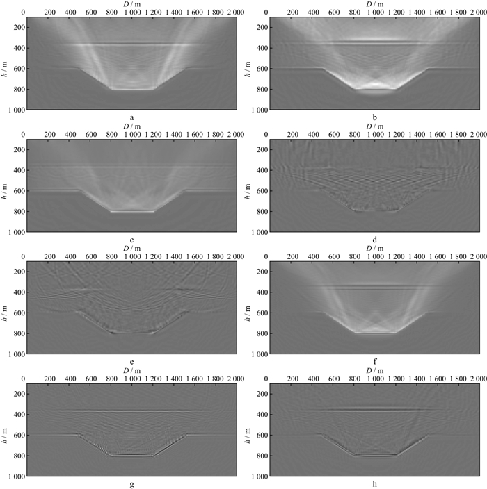 图 6 凹陷模型弹性波多炮偏移叠加结果 a vx分量互相关成像条件偏移; b vz分量互相关成像条件偏移叠加; c 纵横波波场分离PP波偏移多炮叠加; d 纵横波波场分离PS波偏移多炮叠加; e 纵横波波场分离SP波偏移多炮叠加; f 纵横波波场分离SS波偏移多炮叠加; g 能量范数成像条件x分量偏移多炮叠加; h 能量范数成像条件z分量偏移多炮叠加 |