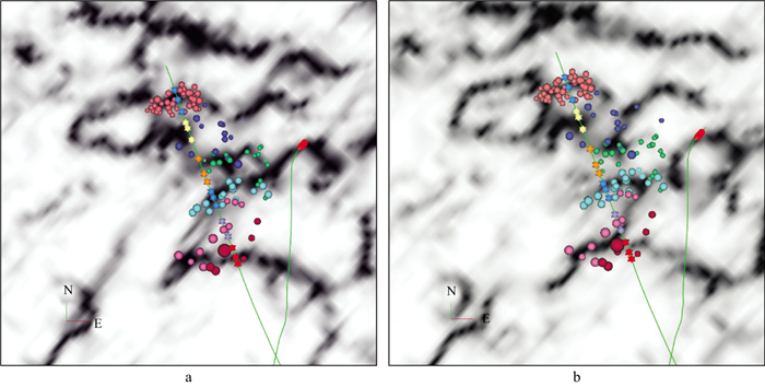 图 11 微地震事件和相干体切片叠合显示(实例二) a 3 240m相干体切片; b 3 250m相干体切片 |
