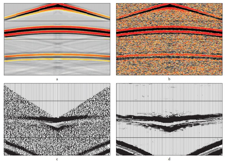 图 2是图 1所示不同信噪比合成记录的曲波系数分布。图 2d中无噪声的合成记录经过曲波变换后, 其系数在曲波域内分布于有限区域内, 白色直线即为有效信号; 图 2c中有效信号的曲波系数在曲波域内分布位置与图 2d中相同且幅值相对较大, 在其它各区域可看到幅值相对较小且零星分布的随机噪声系数; 图 2b中有效信号曲波系数在曲波域内的位置依然与图 2d中相同, 随机噪声曲波系数在曲波域内各位置均有分布, 其幅值相比图 2c中有所增大, 有效信号依然清晰; 随着信噪比的降低, 曲波域各区域分布的随机噪声曲波系数幅值逐渐增大, 但仍然能够看到有效信号, 且其位置没有变化, 见图 2a。