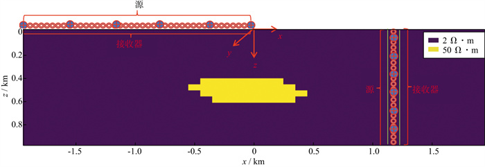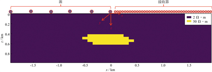 对此模型的测量采用间隔分布的方式, 在z=0的地面, x=-2000m至x=0区间以400m水平间距均匀布设6个发射源, 同时在地面(z=0)上的x=50m处至x=2000m处, 以50m水平间距均匀布设40个接收器(图 1)。在整个测量过程中, 当其中一个发射源工作时, 其它发射源处于关闭状态, 依次进行信号的发射与数据采集, 共进行6次信号的发射与采集工作。