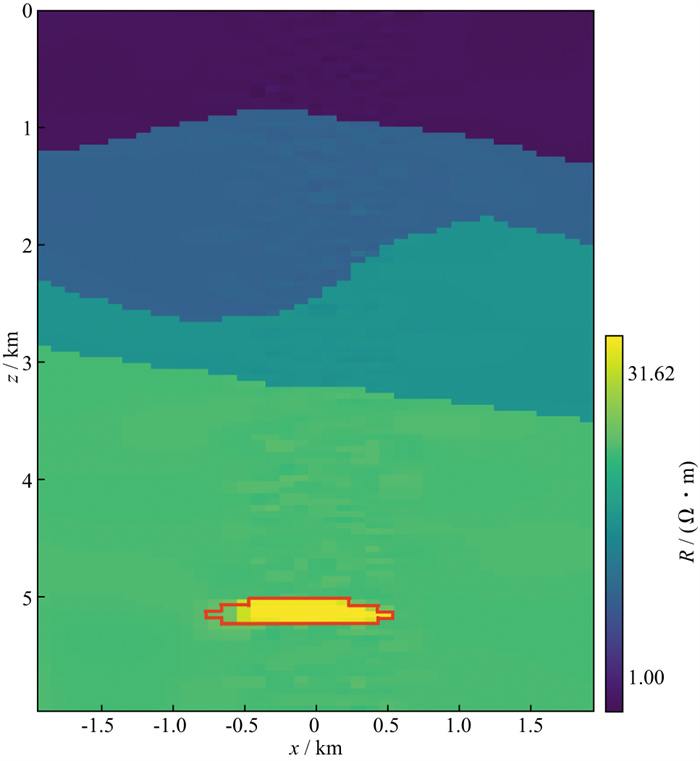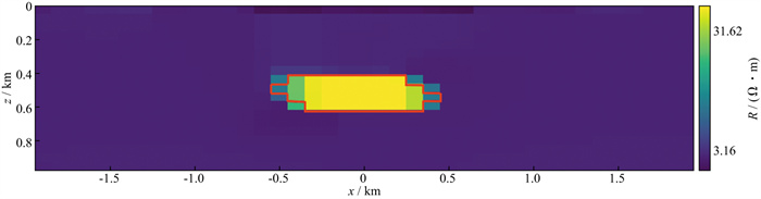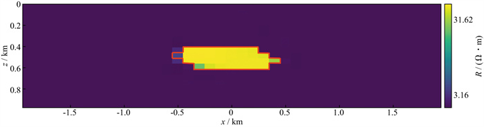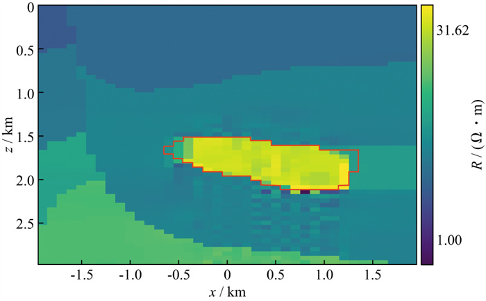 图 8 基于地对井模型的油气藏反演电阻率图像(红色线框表示真实油藏体的轮廓) |