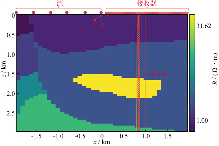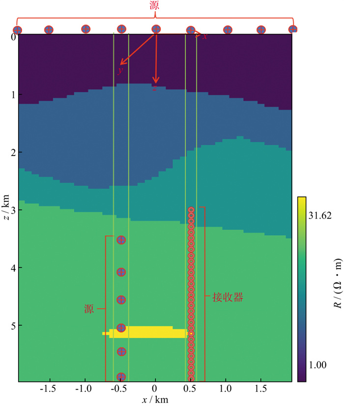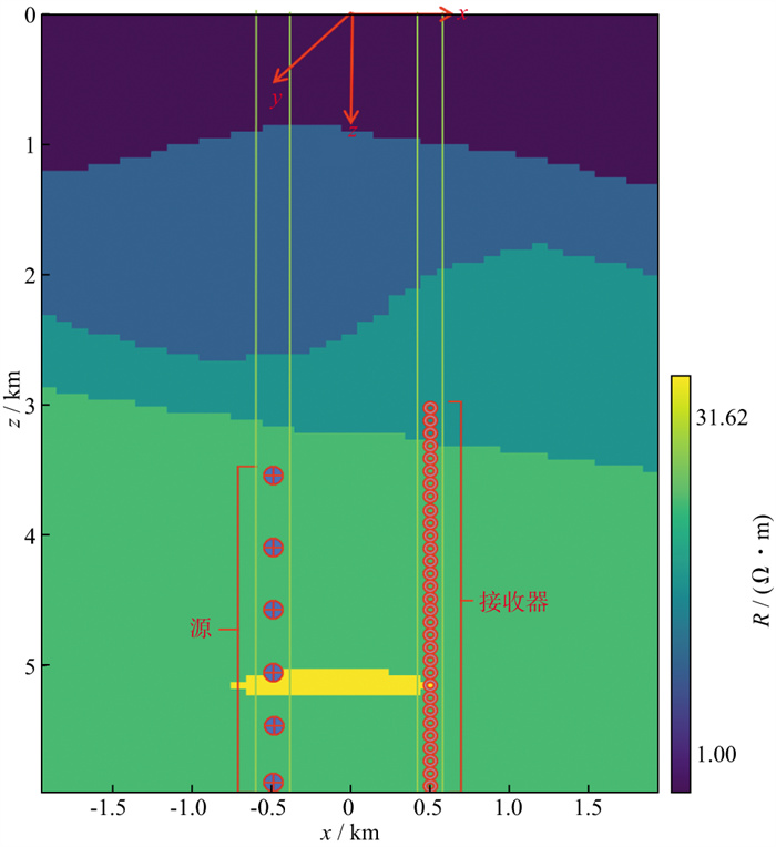 塔河油田具有丰富的碳酸盐岩缝洞型油气藏资源, 在缝洞型油气藏的后期开发当中, 对其储层变化进行监测是一个重要问题。由于地-井电磁方法的探测深度有限, 因此先使用井间电磁进行实验, 如图 16所示。参考塔河油田十区西工区的碳酸盐岩储层, 建立一个长4000m, 深6000m的缝洞型油气藏勘探模型。该模型背景介质为各向同性, 在其内部构造一个缝洞型油气藏, 此油气藏的上顶面到地面的距离为5000m, 长约1000m, 厚约200m, 将该油气藏电阻率设为50Ω·m, 背景地层的电阻率设为0.6~10.0Ω·m。在x=-500m处和x=500m处构造两口垂直井, 在x=-500m处的井中悬挂一个源, 让源在z=3500m到z=6000m间以500m垂直间距向下移动并发射信号, 在x=500m处的垂直井中z=3000m到z=6000m间以100m垂直间距均匀布设31个接收器。