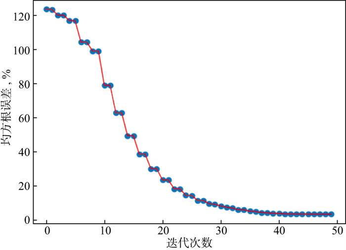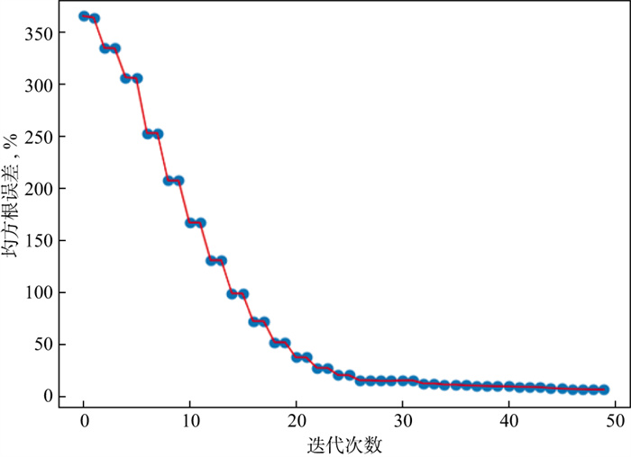 采用yHED-Ey配置(针对地面接收)和yHED-Hz配置(针对井间接收)获得测量数据, 所用频率为0.5, 1.0, 2.0Hz。初始模型是电阻率为10Ω·m的均匀介质。图 14和图 15分别是反演得到的电阻率图像和相应的反演误差迭代曲线, 经过49次迭代后最终均方根误差为5.35%。可以看到, 反演图像能够很直观地反演出油气藏异常体的位置, 地层分界线和挤压断层也能清晰地识别, 油气藏在横向上的轮廓反演结果较为理想, 与原始模型十分接近, 反演结果表明地-井电磁方法可以较为精准地识别本模型所示的1500m深度的典型复杂油气藏的大小和位置。