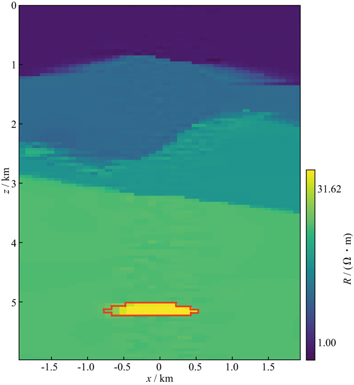 图 14 基于地-井电磁模型的复杂油气藏反演电阻率图像(红色线框表示真实油气藏的轮廓) |