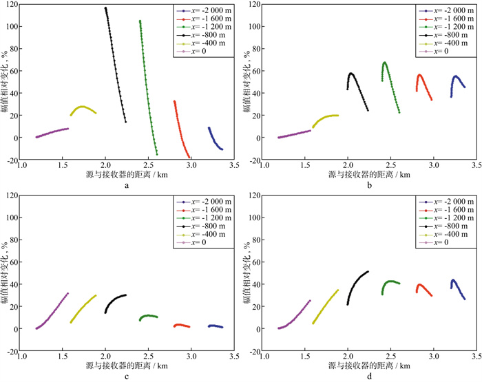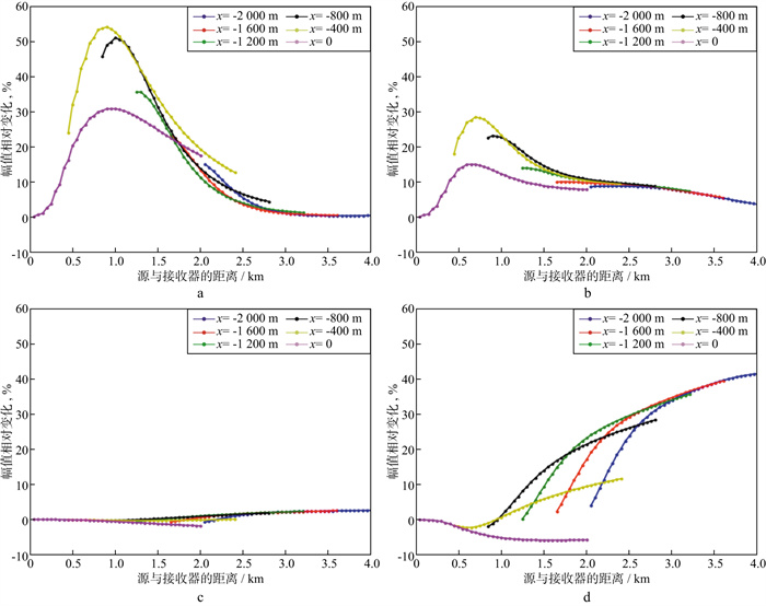 图 2显示了地面电磁模型不同的源随着源与接收器距离的变化其电磁场幅值相对变化的曲线。对比图 2a、图 2b、图 2c和图 2d发现, 当采用yHED-Ey测量配置时, 在频率为0.1Hz情况下, 电磁场分量的幅值变化高于VMD-Hz测量配置下电磁场分量的幅值变化, 而在1.0Hz情况下, VMD-Hz测量配置对油气藏的灵敏度大大提高, 并达到与yHED-Ey测量配置下类似的灵敏度; 采用yHED-Ey测量配置时, 在0.1Hz下所测得的电磁场分量幅值变化高于在1.0Hz下所测得的电磁场分量的幅值变化, 表明在此模型下采用yHED-Ey测量配置, 在一定范围内频率较低时, 对油气藏的灵敏度更高; 在VMD-Hz测量配置下, 频率为1.0Hz所测得的电磁场分量的幅值变化高于在0.1Hz下所测得的电磁场分量的幅值变化, 表明在此模型下采用VMD-Hz测量配置, 在一定范围内频率较高时, 对油气藏的灵敏度更高。
