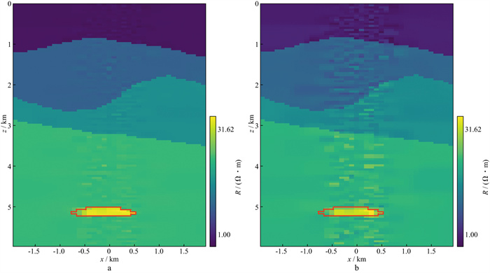 为检验联合反演模型的抗噪能力, 分别在数据中加入5%噪声和10%噪声进行测试。图 20a是加入5%噪声情况下反演得到的电阻率图像; 图 20b是加入10%噪声情况下反演得到的电阻率图像。可以看出, 噪声导致假异常增多, 但仍可看出油气藏的空间位置且电阻率得到较好的恢复。说明联合反演模型具有一定的抗噪性。但实际作业时, 为追求最终结果的精度, 需要尽量将噪声控制在一个较低的水平。