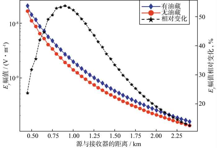 为了展示实际测量电磁场分量的大小, 图 3给出了图 1所示油气藏模型的电磁场分量Ey幅值随源与接收器距离的变化曲线(频率为0.1Hz, 源在x=-400m)。由图 3可以看出, 当源与接收器的距离约为1.00km时, Ey幅值的变化最大。