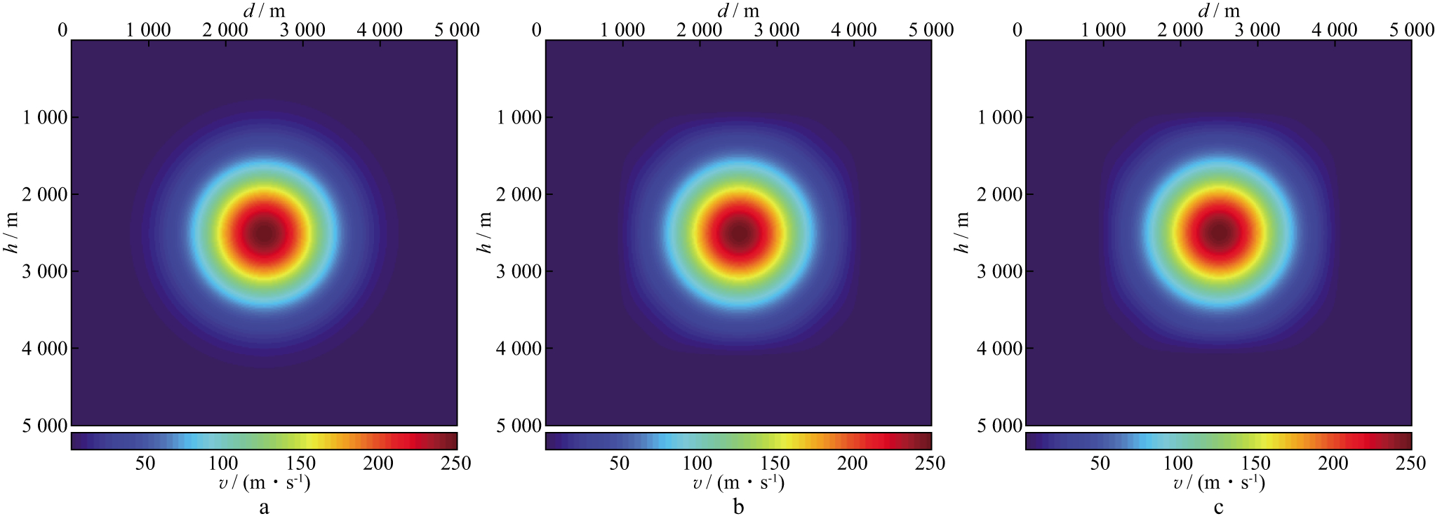式中: ε为速度扰动百分比; v0=2500m/s为均匀背景速度; a为高斯异常体的尺度参数; (x0, z0)为高斯异常体的中心坐标, (x0, z0)=(2500m, 2500m)。