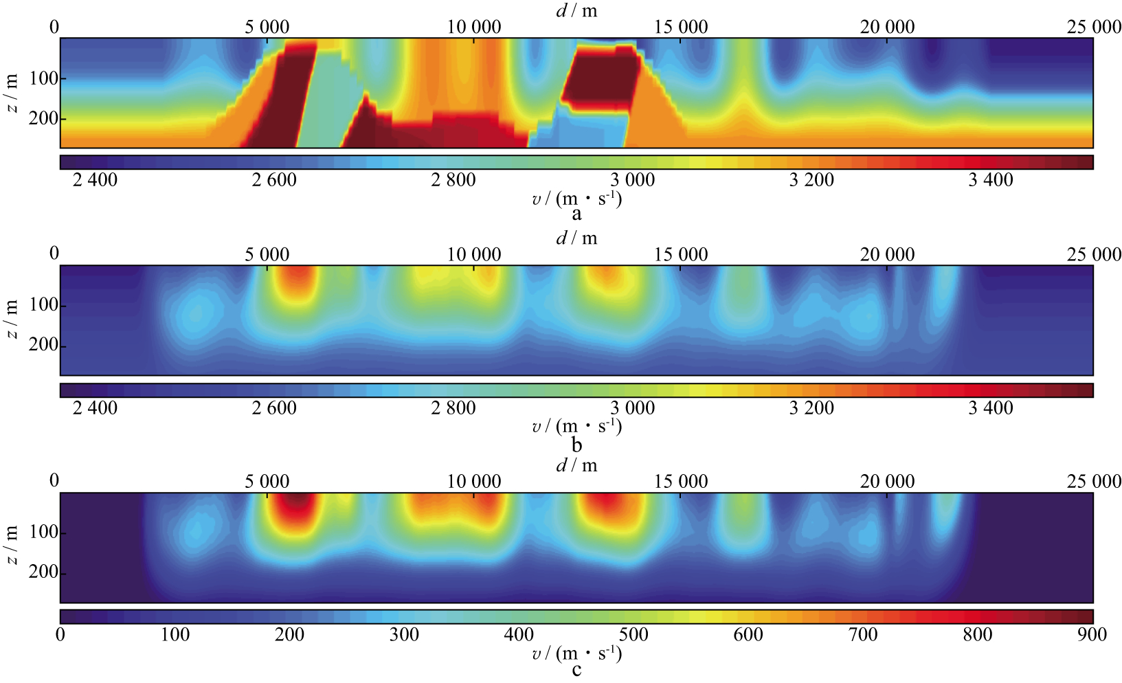 图 2 横向长度为25000m的SEG/EAGE Overthrust近地表速度模型(a)、采用双差走时层析反演方法得到的速度模型(b)及速度扰动(c) |