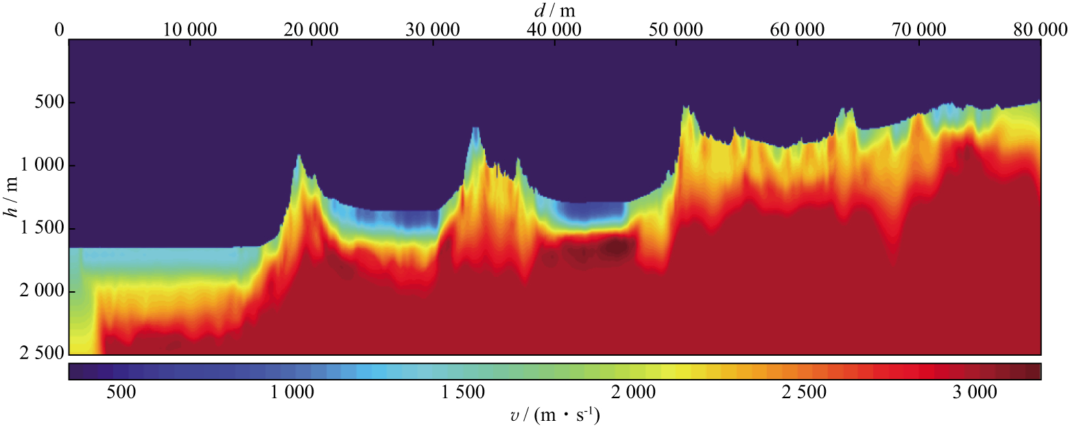 采用中国某地二维陆上实际地震资料(共1638炮, 双边接收, 最大偏移距7132m;炮间隔60m, 道间距10m)进行测试, 该地震资料采用初至自动拾取方法得到(拾取起震时刻)。初始模型采用线性递增速度模型(起伏地表之上用空气速度填充), 震源子波为主频为10Hz的Ricker子波, 基于相同的初至拾取标准得到模拟数据的初至, 并采用多偏移距反演策略(最大偏移距分别为3000m, 2000m, 1000m, 500m, 每个尺度迭代8次), 得到如图 4所示的最终反演结果, 可以看出最大有效反演深度约为700m。从反演结果可以看出, 山间低速带得到了较好的刻画(近地表速度低至800m/s, 低速带厚度约为200m), 这与野外实际地表露头结果相符, 速度模型左侧的平原地带, 反演结果表现出明显的成层性。