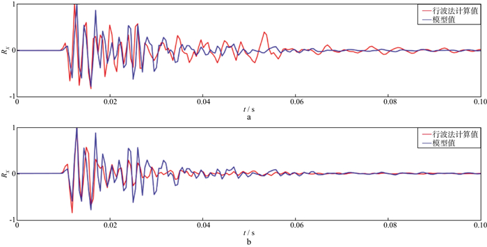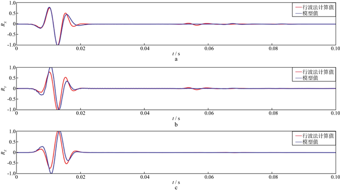 利用前述的有限差分方法, 在弹性小变形假设下, 针对一个水平层状各向同性均匀介质模型, 模拟六分量地震记录, 对比由平动分量经行波法计算得到的旋转分量与模型理论模拟值之间的差异, 归一化后的旋转分量如图 10所示。可以看出, 直达波的行波法换算旋转分量与理论模拟旋转分量在初至时间、直达波波峰、波谷位置对应时间上具有良好的一致性, 在相位上也与模拟值一致[20]。