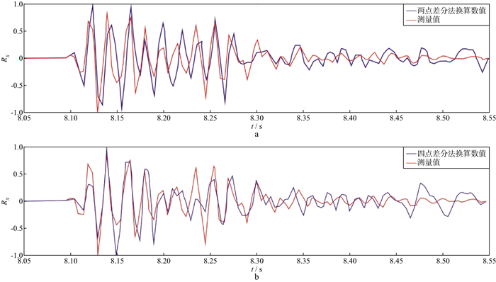 图 8 两点(a)和四点(b)差分法计算的RX分量时间域波形对比 |