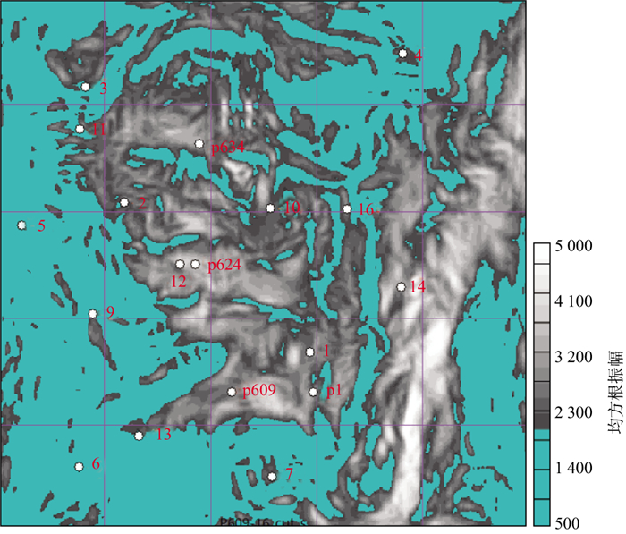 方向可控金字塔方法需要对金字塔结构中每一个子带信息进行S函数控制和方向估计, 既有效压制了地震属性中的噪声, 突出了主要地质体的轮廓和分布特征, 又表征了地质体的方向。由本文方法得到的结果可知, p609井、1井和p1井位于同一个地质体, p624井和12井位于另一个地质体, p634井位于一个地质体, 10井和16井分别位于一个地质体, 以上地质体均为北西西方向, 14井位于另一个地质体, 为北北东方向, 各个地质体呈孤立状。各井累产油量与原始地震属性相关性较差(图 10a), 经方向可控金字塔方法处理后, 相同环境的沉积地质体地震属性与各井累产油量相关性较好(图 10b), 除位于东部辫状河沉积的14井外, 主体区扇三角洲沉积区的各井累产油量与处理后地震属性呈正相关关系。对于同一地质体, 各井累产油量与地震属性较接近, 如p609井、1井和p1井, 因此方向可控金字塔方法对地质体边界识别和油气开发具有一定的指导意义。