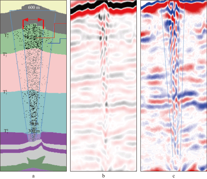 对如图 1a所示的地质模型进行BEMD分解测试。该模型通过在断裂带内添加不同大小和发育密度的缝洞体来模拟断溶体的分带性, 其中断溶体核部为大尺度缝洞体且缝洞体发育密集, 翼部缝洞体尺度相对较小且发育密度低, 断溶体上覆地层为泥岩层。从地震剖面可以看出, 断溶体发育的碳酸盐岩地层上部存在强能量地震同相轴, 影响了断溶体的特征识别, 此外, 断溶体弱破碎带(相当于断溶体翼部)地震响应呈现弱反射特征, 当破碎程度较强(相当于断溶体核部)时, 地震响应表现为杂乱异常反射特征(图 1b)。BEMD分解结果(图 1c)在一定程度上使异常更聚焦, 同时对背景数据进行了压制。对模拟地震数据进行处理, 通过BEMD分解得到单频或多频段内的不同组合剖面, 分解得到的剖面分别代表IMF1, IMF2, IMF3分量。分析其有效频段数据组合方式获取有效的BEMD提取结果(图 2), IMF1分量主要反映断溶体空间异常特征, IMF2分量主要反映地层结构信息, IMF3分量代表算法分解的残差部分, IMF1分量增强了断溶体地震响应特征信息, 为实际工区效果分析奠定了基础。