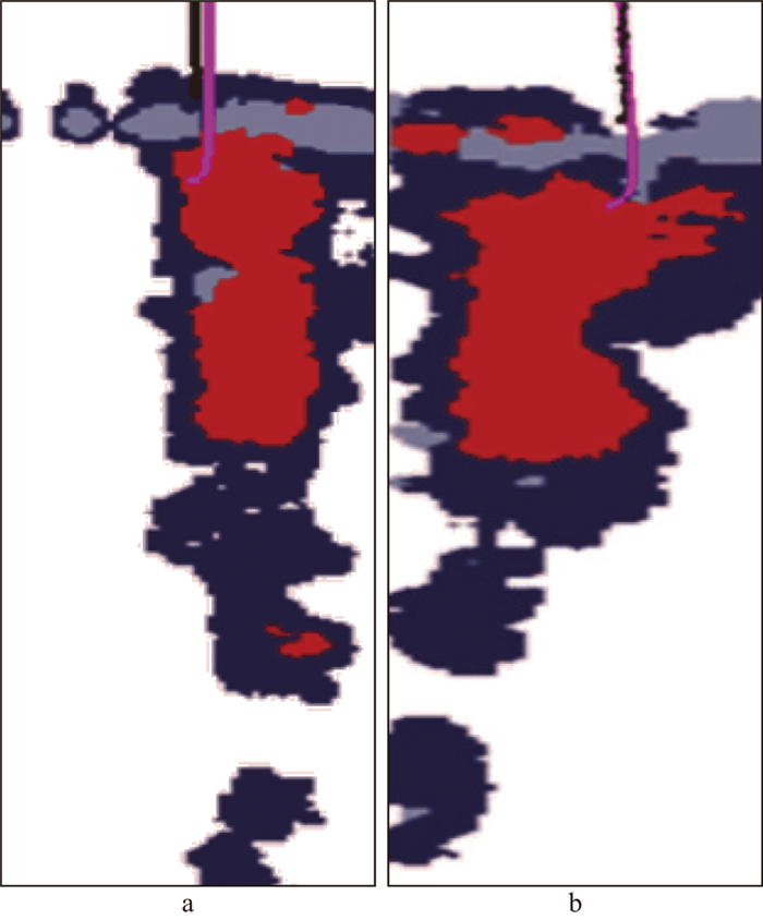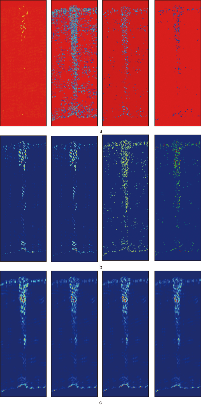 选取如图 1a所示模型进行纹理属性提取分析, 为了更好地识别断溶体发育特征, 提取不同方向、不同灰度级、不同窗口的纹理属性, 结果如图 3所示。其中对比度属性、熵属性、能量属性均可表征剖面上的断溶体, 优化后的纹理属性连续性得到了增强, 其中熵属性更为连贯, 说明断溶体灰度值变化较大。