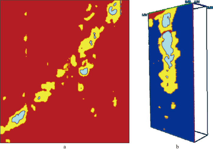图 11 多属性聚类断溶体分带性聚类结果时间切片(a)和三维可视化结果(b) |