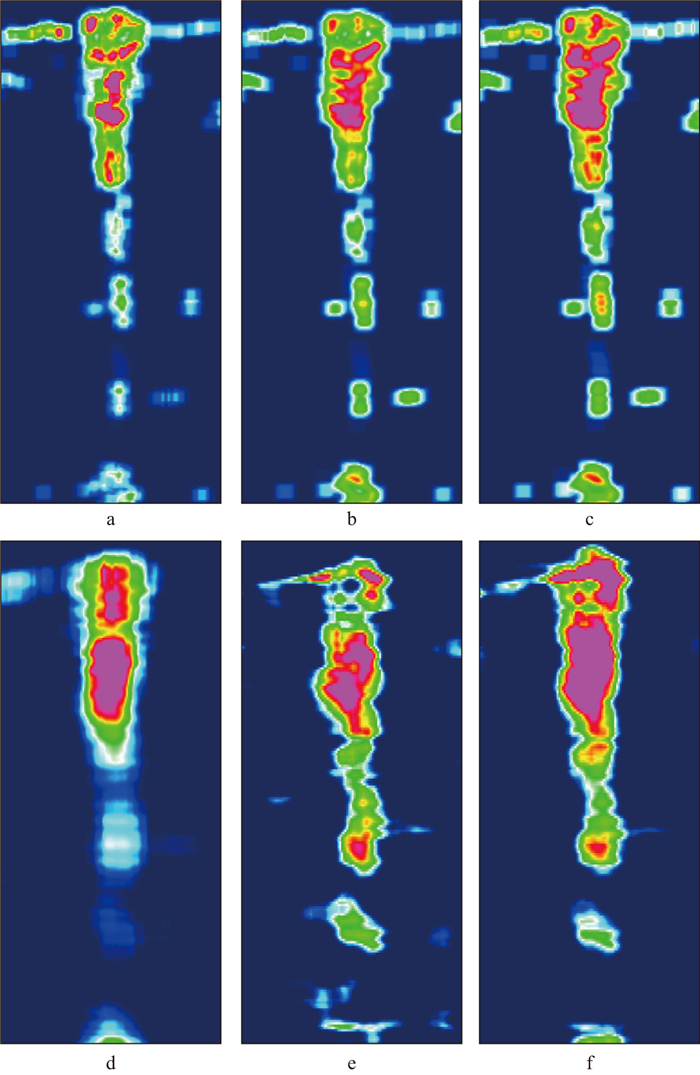 图 3 纹理属性提取结果 a某商业软件的对比度属性; b某商业软件的能量属性; c某商业软件的熵属性; d采用本文方法得到的对比度属性; e采用本文方法得到的能量属性; f采用本文方法得到的熵属性 |