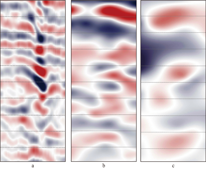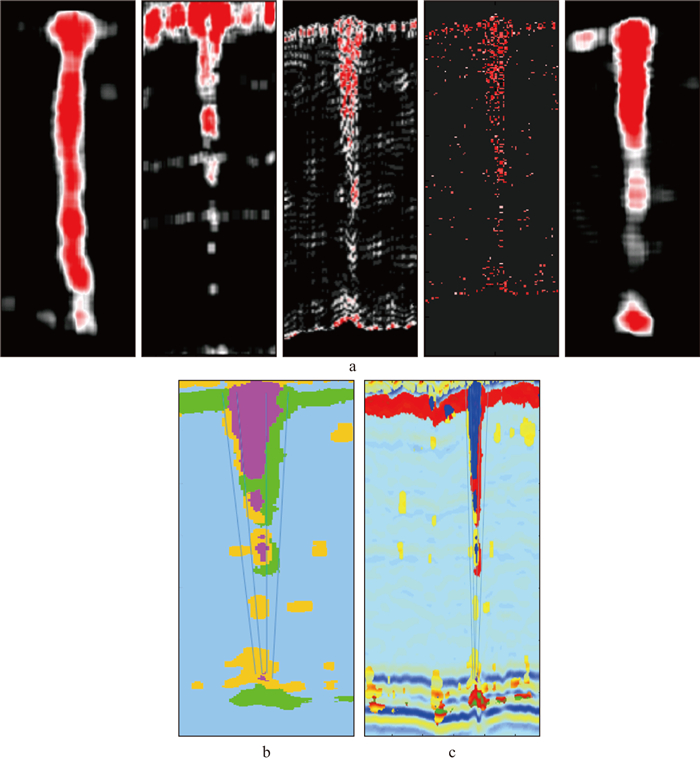 采用上述方法计算相关属性, 模型优选的多种属性如图 5a所示, 从左到右分别是为能量性、熵属性、λ3属性、λ属性和对比度属性。聚类结果如图 5b所示。利用该方法可以实现断溶体的分带性预测, 聚类结果证实了方法的有效性。将属性聚类结果和原始剖面叠合显示(图 5c), 聚类结果与所设计模型的分带性高度吻合, 证明了算法的合理性。