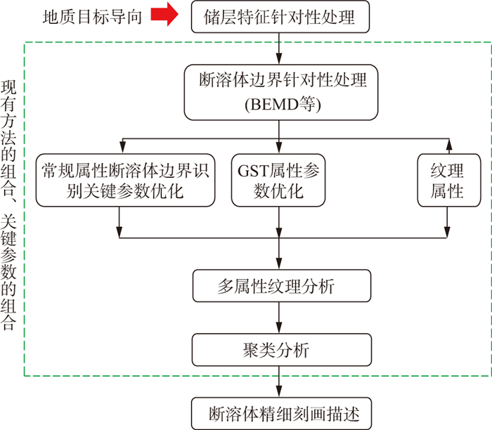以断溶体地震响应特征增强预处理方法为基础, 开展以纹理属性和GST属性为核心的多属性断溶体识别分析, 结合空间描述和分带性识别技术, 提出了针对断溶体的一体化处理识别方法, 具体流程见图 6。
