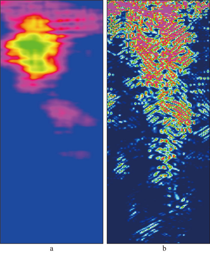 图 9 对预处理后的实际地震资料提取的纹理属性(a)和梯度结构张量属性(b) |