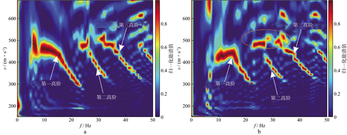 从实际地震数据中提取完整、准确的多模式面波频散曲线并非易事。受体波信号和强干扰噪声的影响, 面波频散能谱会发生扰动, 因此难以辨别面波模式[11]。图 1展示了反射波对瑞利波频散能谱的影响[41]。从图 1a可以看出, 在无反射波影响时, 可以清晰判别高阶瑞利波的阶数。从图 1b可以看出, 当瑞利波与深部反射波在时空域形成强干涉时, 能谱极大值的位置发生偏离, 无法判别椭圆圈中所示能谱的模式, 这种情况下, 如果直接根据图 1b拾取频散曲线, 会引起模式误判。此外, 不同模式的瑞利波在地震记录中相互干扰, 实际提取到的频散曲线往往表现为多个模式的叠加, 容易引起模式跳跃, 与理论频散曲线不完全对应, 给面波模式的识别造成困难[42-44]。模式跳跃极易引发模式误判的问题, 导致最终反演的横波速度不准确[14, 42]。模式跳跃本质上反映了瑞利波各个模式下的激发能量相对大小随频率变化的关系[42]。对于含低速层的层状介质, MI等[45]认为软弱层间形成的高频导波无法从软弱层穿透到地表, 不能形成对应的面波, 因而造成频散能谱高频缺失, 进而导致频散能谱的不连续或模式跳跃。同样地, 实际提取的瑞利波频散曲线只是理论频散曲线中的一段, 不完整、不准确的频散曲线会导致不稳定、不可靠的反演结果[15]。