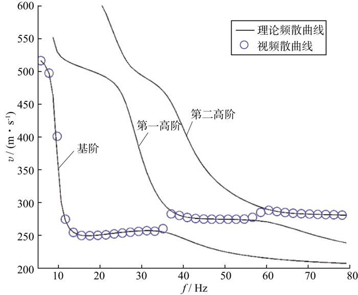 式中:Vr, Vz分别为R分量、Z分量地震数据瑞利波视频散曲线对应的相速度; w1, w2分别为R方向和Z方向的位移特征函数[50]; i或j均为瑞利波的阶数; ki, kj为波数; ci, cj为相速度; Ui, Uj为群速度; Ii, Ij为瑞利波第一能量积分[50]; r为偏移距; z, zs分别为检波点和炮点的深度。根据表 1所示的模型1参数, 得到的瑞利波理论频散曲线和Z分量的视频散曲线如图 2所示, 可以看出, 在38 Hz处, 视频散曲线从基阶跳跃到第一高阶; 在59 Hz处视频散曲线从第一高阶跳跃到第二高阶。视频散曲线可用于预测多模式瑞利波的能量分布规律, 研究多模式面波的叠加效应[51]。视频散曲线能直接用于反演横波速度结构, 无需辨别面波的模式, 避免了前述频散曲线的模式误判问题[52]。