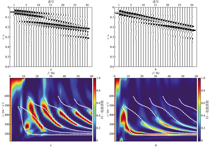 图 3 根据模型2参数合成的R分量、Z分量瑞利波记录及其频散能谱[15](图中白色虚线是理论频散曲线) a R分量瑞利波记录; b Z分量瑞利波记录, c R分量频散能谱; d Z分量频散能谱 |