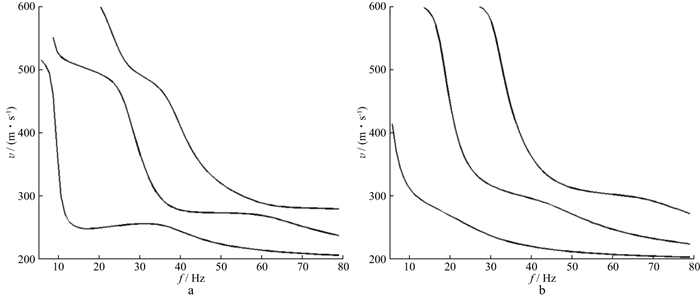 图 4 模型1瑞利波(a)和勒夫波(b)的理论频散曲线 |