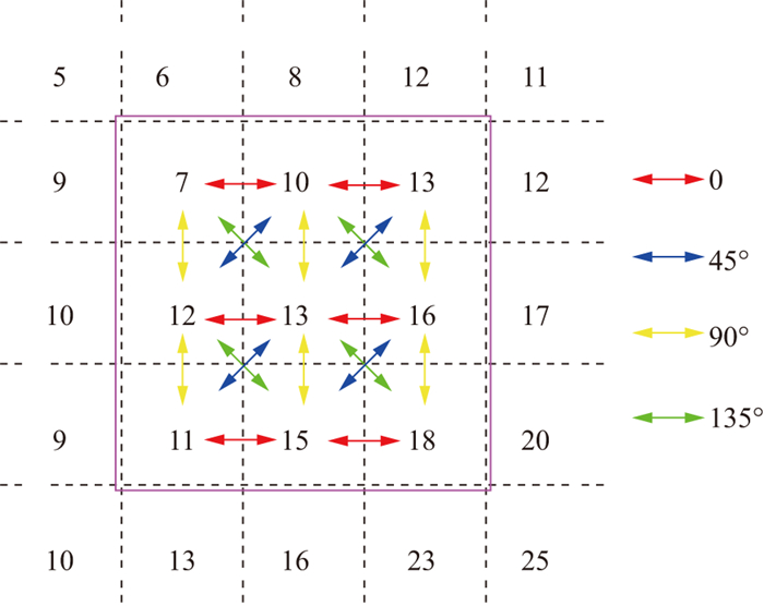 以图 1红框所示的3×3范围为例, 当θ=0时, 灰度值为7和10的像素点对只有一个, 所以P7, 10=P10, 7=1。而在(3)式中, 当θ为0°或者90°时, 则R=2×Wx×(Wy-1);当θ为45°或135°时, 则R=2×(Wx-1)×(Wy-1)。