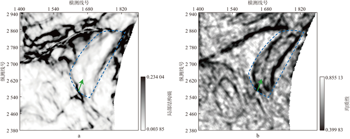 相较于根据地震数据计算得到局部结构熵属性沿目的层的切片(图 10a), 根据均方根振幅属性计算得到的灰度共生矩阵均质性切片(图 10b), 目标复合砂体的边缘更加清晰, 在可能存在砂体重叠的位置能隐约识别出不连续性特征。