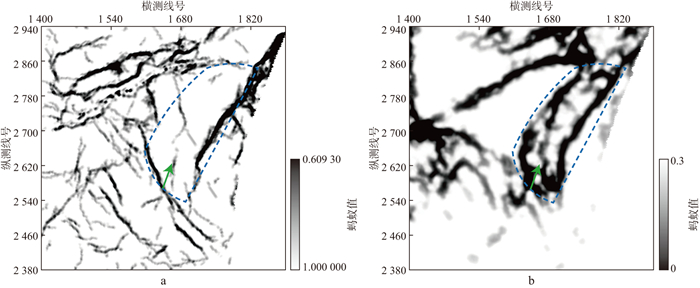 在局部结构熵属性上使用常规蚂蚁追踪优化得到目的层切片数据(图 11a), 对目的层应用路径弯曲度约束的蚁群算法进行平面增强后的结果(图 11b), 可以看出两种不连续性特征优化算法对于实际数据噪声均具有良好的压制作用。受益于均质性结果的不连续性特征相对显著, 在使用本文提出的路径弯曲度约束蚁群算法进行平面增强后, 目标复合砂体无论是边缘还是内部的不连续性特征都更加突出。而作为对比的蚂蚁追踪结果, 则因为局部结构熵对砂体边缘响应较弱, 故将砂体范围内的不连续性特征与断层的特征错误连接起来造成了假象。
