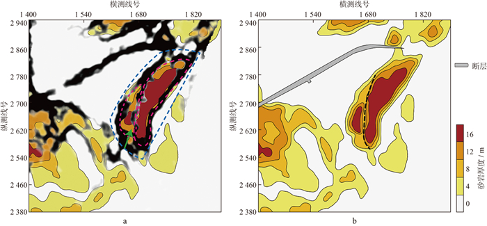将图 11b获得的不连续性特征叠加到图 9a所示砂岩厚度预测结果上, 得到图 12a所示的叠加显示结果。由叠加后的平面图分析可知, 目标复合砂体可能由一个小砂体和一个大砂体的叠置相切形成, 而通过不连续性特征约束砂体厚度预测结果, 可以获得对目标砂体平面展布更精细的认识(图 12b)。