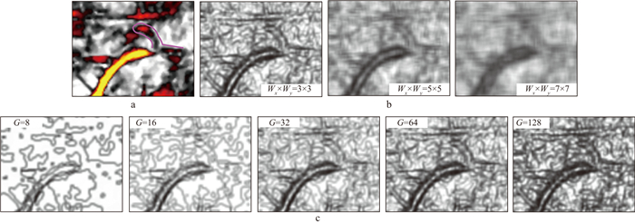 图 2 不同参数计算灰度共生矩阵均质性效果 a原始均方根振幅属性; b灰阶数G=64, 不同Wx×Wy; c Wx×Wy为3×3, 不同灰阶数G |