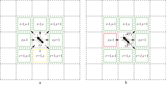 以图 3为例展示在路径弯曲度约束下, 蚂蚁分别位于起始点和非起始点时, Ω(r, s)中转移候选点的情况。图 3中绿色框表示该点是类断层点, 黄色框表示该点不是类断层点, 而红色框表示不可向该点移动, 一般为该蚂蚁之前已经走过的点或没有均质性数据的点; 黑色箭头指向可以转移的点。当坐标为(r, s)的点为起始点时(图 3a), 蚂蚁可以向周围8个方向移动, 但可移动方向上存在类断层点时, 禁止向非类断层点转移, 所以黄色框的点不会包含在该Ω(r, s)中; 如果坐标为(r, s)的点并非起始点(图 3b), 蚂蚁可移动方向受到上一步已移动方向的限制, 所以Ω(r, s)中只包含箭头所指的3个点。因此, 蚂蚁根据(6)式计算向Ω(r, s)中每个候选点转移的概率, 然后蚂蚁根据候选点转移概率大小随机移动到候选点上, 完成本次移动。