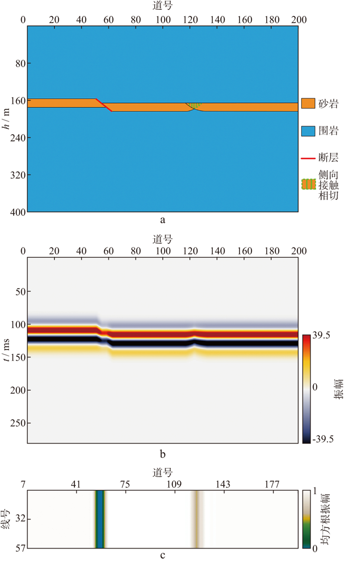 图 4b的地震剖面由图 4a模型与30 Hz的零相位雷克子波褶积生成, 砂岩层厚度略小于调谐厚度。由于本文检测技术针对三维地震数据, 因此将上述地震剖面复制63个构成一个三维数据体, 然后以剖面中最强的波峰和波谷作为该砂岩层的顶层和底层, 提取这两个层位间的均方根振幅属性, 结果如图 4c所示, 可以看出, 断层和砂体相切的不连续性结构均引起了均方根振幅属性值的变化。