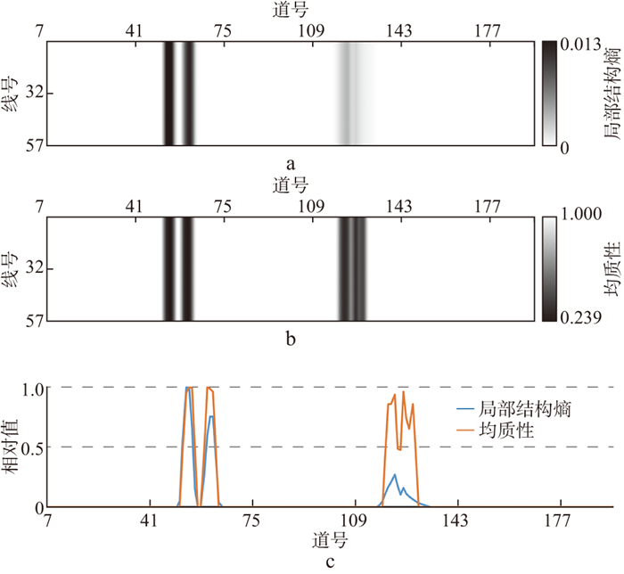 图 5a为沿砂岩层位中间提取的局部结构熵体切片, 图 5b为对砂岩层均方根振幅属性计算得到的灰度共生矩阵均质性。对比图 5a和图 5b可以发现, 无论是局部结构熵还是均质性, 在断层位置都出现了明显的不连续性特征。在砂体相切的位置, 局部结构熵的响应明显变弱, 而从均质性结果中依然能看到明显的不连续性特征。从上述平面数据中各抽出一条In-line的数据, 均都转化到0~1的区间, 它们数值越接近1表示不连续性越高, 越接近0表示不连续性越低, 将转化后的地震数据绘制成曲线, 结果如图 5c所示。对局部结构熵而言, 砂体相切的不连续性特征响应峰值约为断层响应峰值的26.83%, 而其均质性约为断层响应峰值的96%。这表明在无噪声的理论模型中, 采用本文方法得到的均质性结果能更好地突出薄层中隐蔽的不连续性结构。