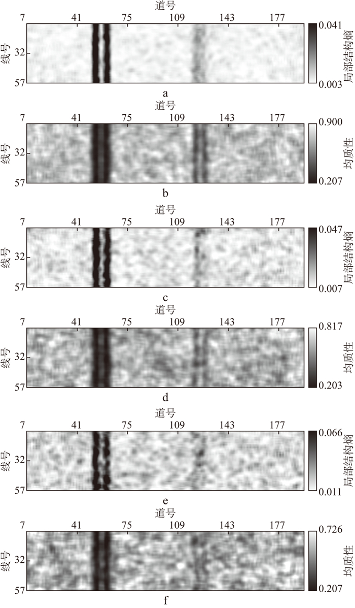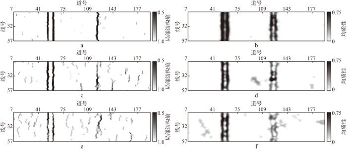 图 7 不同信噪比数据砂岩层位置计算得到的局部结构熵和采用本文方法计算得到的均方根振幅均质性 a信噪比为12.56 dB的地震数据体局部结构熵; b信噪比为12.56 dB的地震数据体均质性; c信噪比为9.04 dB的地震数据体局部结构熵; d信噪比为9.04 dB的地震数据体均质性; e信噪比为6.52 dB的地震数据体局部结构熵; f信噪比为6.52 dB的地震数据体均质性 |
