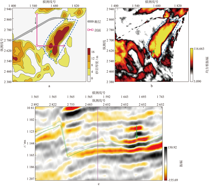 图 9 工区目的层平面数据和地震数据剖面 a砂岩厚度预测结果; b目的层均方根振幅; c沿图 9a红色折线形成的剖面 |
