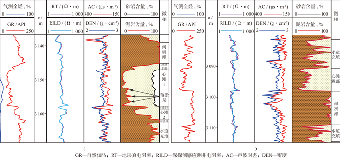 结合杭锦旗十里加汗致密砂岩储层分类及识别标准[22-23], Ⅰ类储层为光滑箱型(含砾)粗砂岩, 孔隙度>10%, 自然伽马 < 60API; Ⅱ类储层为齿化箱型或钟型中-粗砂岩, 孔隙度为7%~10%, 自然伽马 < 70API。A井导眼段于盒3段钻遇单期心滩1主体(六级构型单元), 中下部落淤沉积相对发育, 判断钻遇心滩头部, 为Ⅰ类储层(图 1a)。