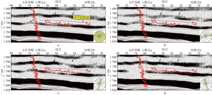 前人研究[7-9]已揭示不同方位资料反射结构具有一定差异, 杭锦旗地区盒3段辫状河道在分方位资料中也表现出不同的响应特征。在相同处理流程和参数条件下, 0°~30°偏移叠加剖面与其它方位角资料在1700~1720ms处, 反射波横向对比关系具有明显差异(图 2蓝色箭头处)。A井导眼段实钻心滩主体, 在全方位及分方位地震剖面上表现较为一致(图 2a红色箭头处)。由于直井资料的单点局限性, 因而无法通过纵向反射结构对比进行储层识别差异分析, 对比水平井与地震横向特征变化相对有效。
