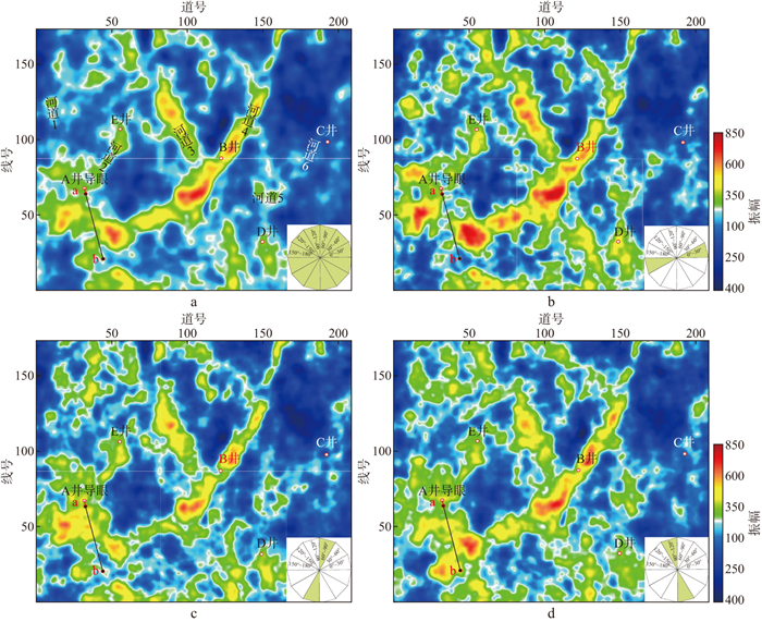 对比B井所钻遇情况(图 1b), 平行河道4走向的60°~90°方位资料(图 3c)相对清晰地显示了B井处于两个单期心滩的过渡带, 并且与A井导眼实钻及瞬时振幅关系更加合理, 90°~120°方位资料(图 3d)次之, 全方位资料及垂直河道走向的0°~30°方位资料(图 3a, 图 3b)最差, 宽方位资料丰富的方位特性得到体现。据此可以推断60°~90°资料对北东走向的次级河道6的响应能力优于其它也是相对合理的。