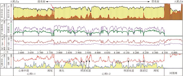 A井水平段钻遇2个六级心滩, 其中心滩1-1在水平段未揭示出其全部结构, 自迎水面至背水面方向, 自然伽马相对抬升, 认为其归属于A井导眼所钻遇心滩1的中后部位, 长度约200m(图 4左部解释所示)。心滩1-2与心滩1-1平行分布, 长度约570m。根据下石盒子组盒3段心滩长宽比(1.7~1.9)[10]以及现代砂质辫状河露头实测宽厚比(30~35)[16]推算, 该心滩厚度同样在10m左右, 与A井导眼段钻遇心滩规模相近。但是, 心滩1-2除了局部存在坝顶水道及落淤层等相对高自然伽马的七级构型单元沉积体之外, 滩头至滩尾自然伽马、声波时差均稳定分布, 并未表现出整体抬升或下降趋势(例如心滩1-1)。作为相邻且平行沉积体, 心滩1-1滩尾与心滩1-2滩头在水平段3770m(图 4红色箭头处)形成突变式接触关系, 而并非常规的滩尾至细砂-泥岩水道充填至滩头的两种微相平行共生特征。此外, 心滩1-2滩尾落淤层[15]发育密度低, 并且4390m处与河漫滩泥岩同样为突变式接触, 说明心滩1-2处于相对水动力作用更强的古地理位置, 尽管厚度未必明显加大。这一特点为分方位资料储层刻画差异性分析提供了有力依据。