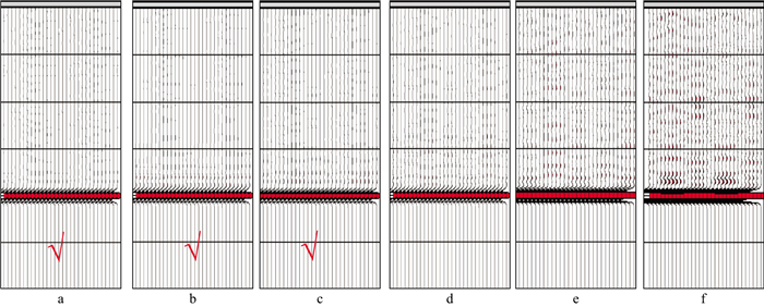 图 5 不同道距的偏移结果 a 10m; b 20m; c 25m; d 50m; e 75m; f 100m |